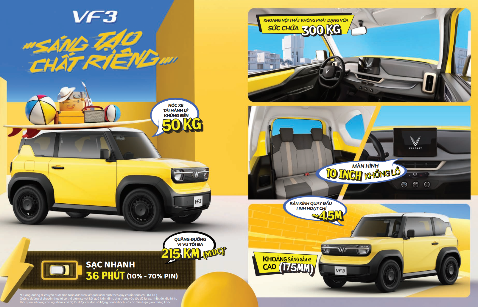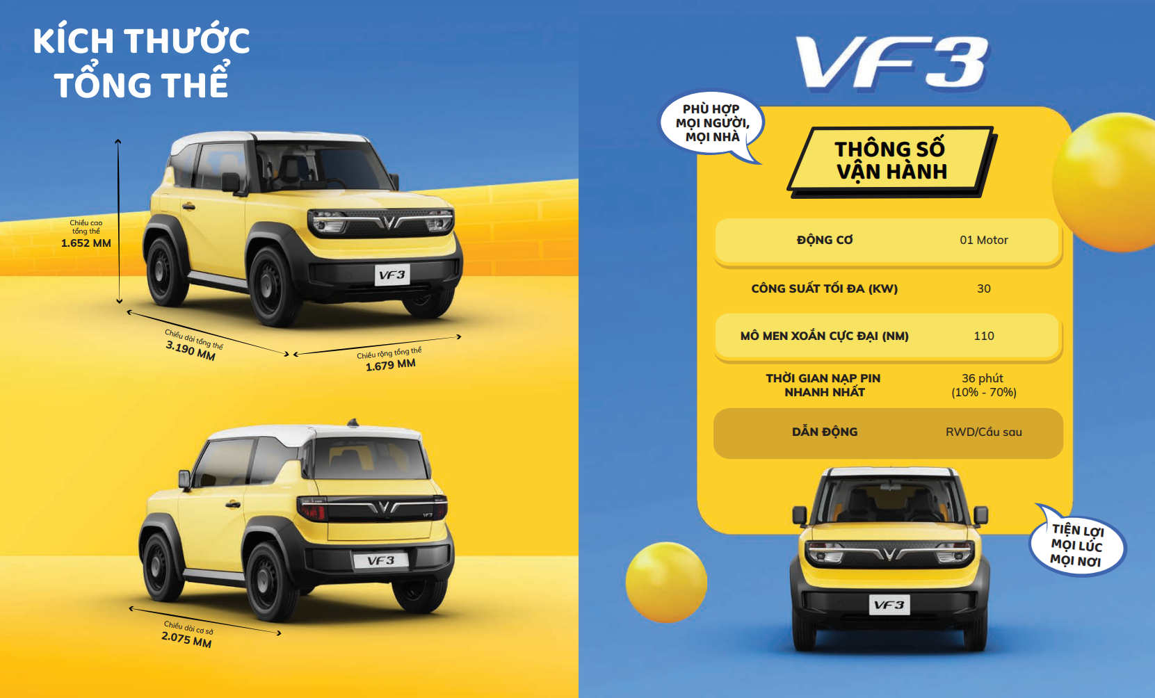 Vượt lên trên một phương tiện di chuyển thông thường, VinFast VF 3 là biểu tượng mới mang tính cách mạng trong cuộc sống đô thị. Với thiết kế hiện đại, hiệu suất vận hành linh hoạt, tính năng an toàn tiên tiến, cùng chi phí vận hành siêu rẻ, VF 3 sẽ mở ra một cách tiếp cận hoàn toàn mới trong việc lựa chọn phương tiện di chuyển hàng ngày, mang lại sự thuận tiện, dễ dàng và đặc biệt thoải mái cho tất cả mọi người.