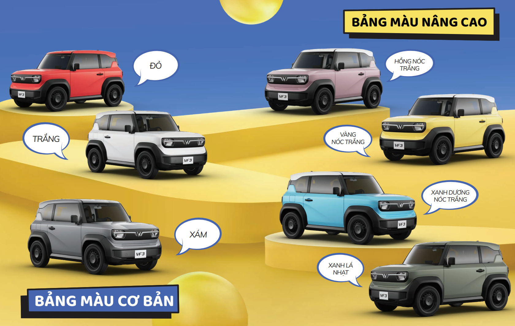Với dải màu ngoại thất đa dạng và độc đáo, bao gồm 7 tùy chọn màu sắc trẻ trung và thời thượng, VF 3 là sự lựa chọn hoàn hảo giúp bạn thoả sức thể hiện sự khác biệt và cá tính của riêng mình. Dù bạn là ai, hãy lựa chọn màu sắc và trang bị VF 3 theo sở thích của bạn, và cùng VinFast biến ước mơ của bạn thành hiện thực.